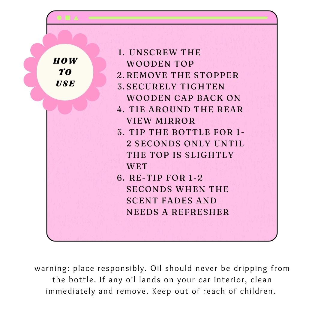 warning: follow directions & use responsibly. oil should never come in contact with the car interior. if oil comes in contact, clean immediately and remove the product. Chubby Star is not liable for any damages.